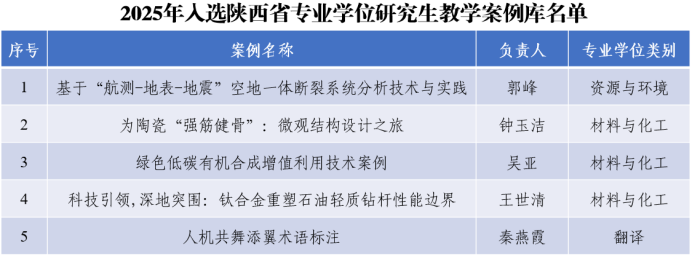 近日,陕西省教育厅办公室、陕西省学位委员会办公室印发《关于公布2025年陕西省专业学位研究生教学案例入库名单的通知》(陕学位办【2026】1号),我校5项教学案例成功入选省级专业学位研究生教学案例库,充分展现了我校在专业学位研究生案例教学与实践育人方面的扎实成效。